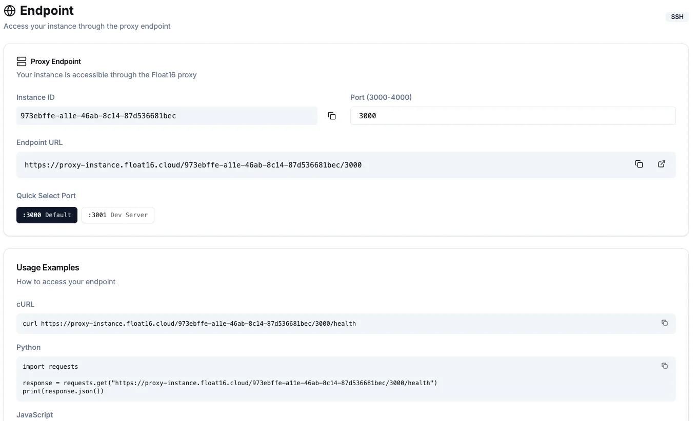 Proxy endpoint พร้อมใช้งาน ไม่ต้องทำ nginx หรือ forward port เพิ่มเติม เพราะเราทำ Proxy Endpoint ให้เรียบร้อยแล้ว สำหรับ Proxy endpoint รองรับการใช้งาน vLLM endpoint, Jupyter Notebook หรือแม้แต่ VS Code Server เรียบร้อย โดย Port จะสามารถใช้ได้ตั้งแต่ Port 3000 ไปจนถึง Port 4000