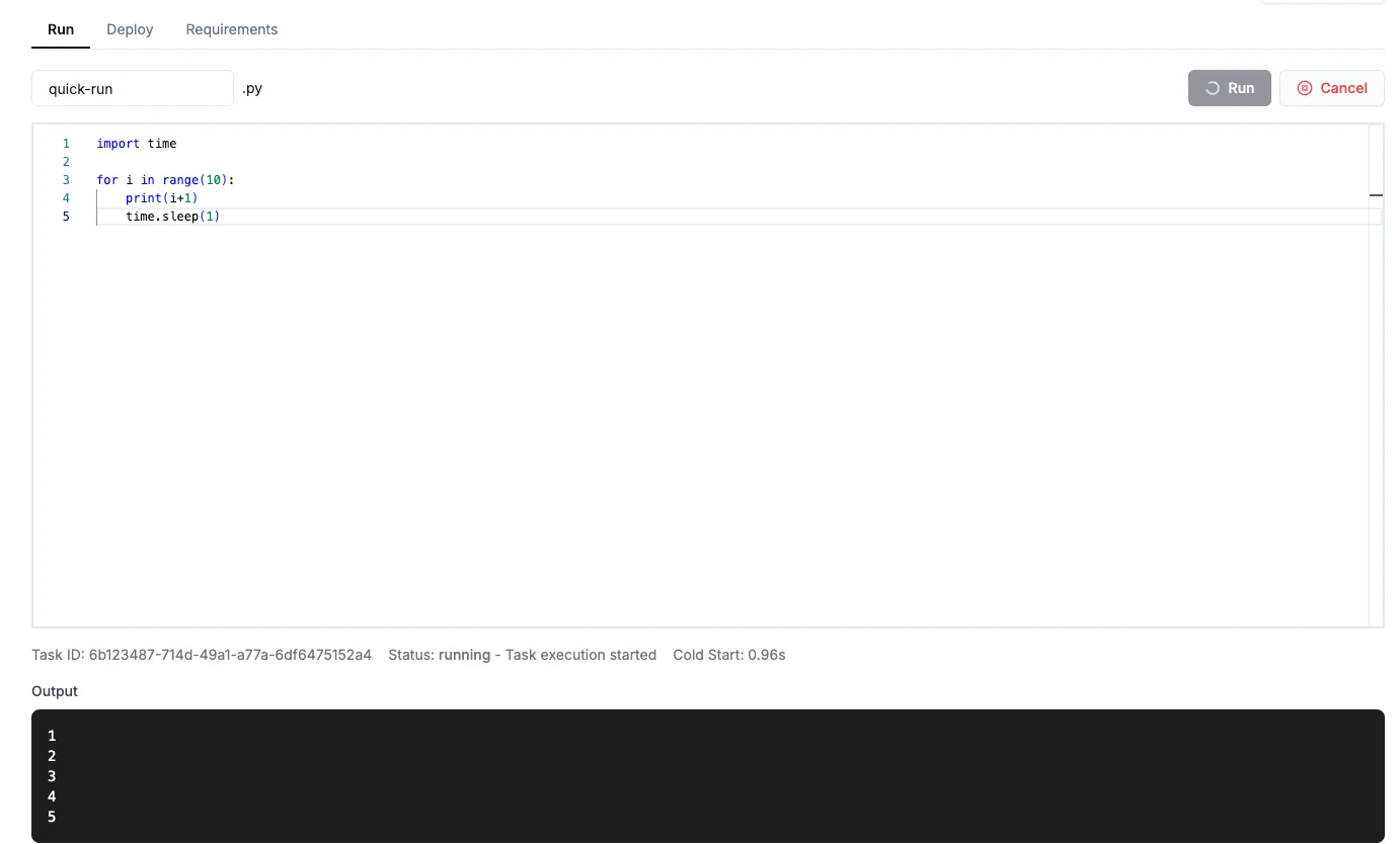 ถัดมาคือ Streaming Output จากข้อจำกัดเดิมของ Serverless GPU v1 ทำให้ไม่สามารถ Streaming Output ออกมาจากการรันแบบ Manual ได้ ซึ่งข้อจำกัดดังกล่าวได้ถูกปรับปรุงใน v2 เรียบร้อยแล้ว เพื่อช่วยเพิ่มประสบการณ์ในการใช้งานและความยืนหยุ่นในการใช้งาน