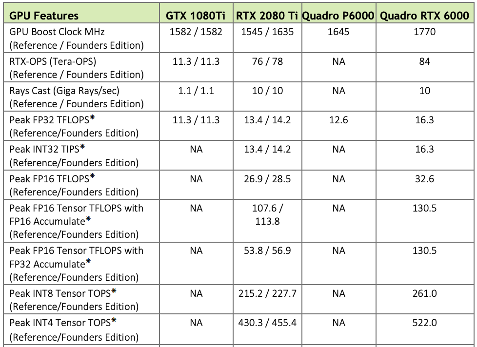และเมื่อเทียบ Cuda Core กับ Tensor Core แล้ว Tensor Core ในรุ่นที่ 1 (Turing) จะมีความเร็วในการประมวลผล Floating Point 16 bit เร็วกว่า Cuda Core อยู่ที่ 4 เท่า หรือ Floating Point 8 bit ที่มาใน Tensor Core ในรุ่นที่ 3 (Ada lovelace, Hopper) ถือว่าเป็นการก้าวกระโดดครั้งสำคัญในการส่งผลให้ AI ใช้ทำงานได้เร็วมากขึ้น
