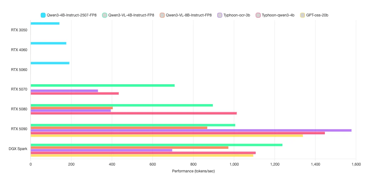โดย tok/s ที่วัดผลถูกวัดจากการใช้งานพร้อมกันที่ 16 ผู้ใช้งานพร้อมกัน ตัวอย่างเช่น Qwen3-4B-Instruct-2507-FP8 ด้วย RTX 3050 ได้ tok/s อยู่ที่ 141.1 ต่อ 16 users แต่ละ user จะเฉลี่ยรับรู้ tok/s ที่คนละ 141.1/16 = 8.82 tok/s